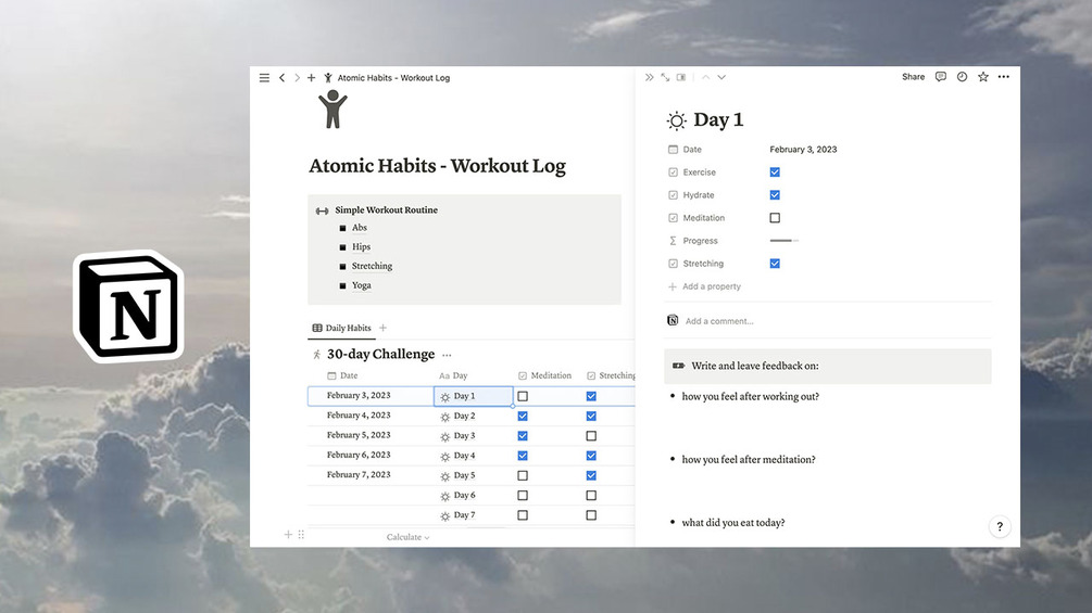 • Habit-tracking template to meditate, stretch, hydrate and workout